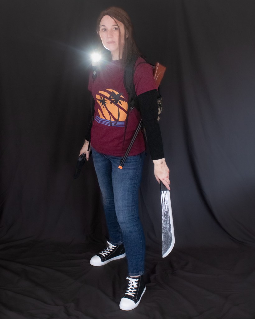 - Ellie: A red or green flannel, jeans, and a backpack. Add fake blood for a more battle-worn appearance.
