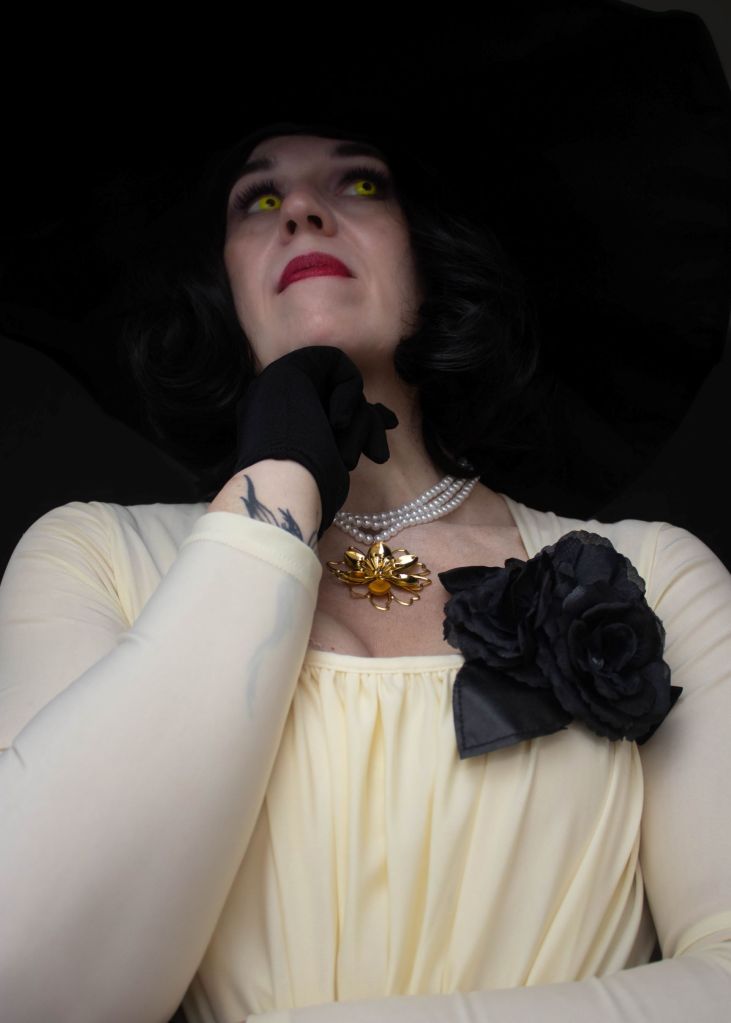 - Lady Dimitrescu: A long white dress, a wide-brimmed black hat, black gloves, and a pearl necklace easily transform you into Lady D. A DIY brooch (made from gold fabric or a button) completes the look.